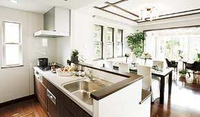 キッチンとリビングダイニングのスムーズなコミュニケーションを可能とするプランです。リビングで寛ぐご家族と談笑しながら、小さなお子様を見守りながら、キッチンでの家事を楽しめます。