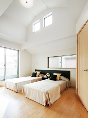 採光性や開放感の向上とともに、天井や壁に変化を与え、室内のデザイン性も高まる勾配高天井。主に2階の居室等に採用されています。