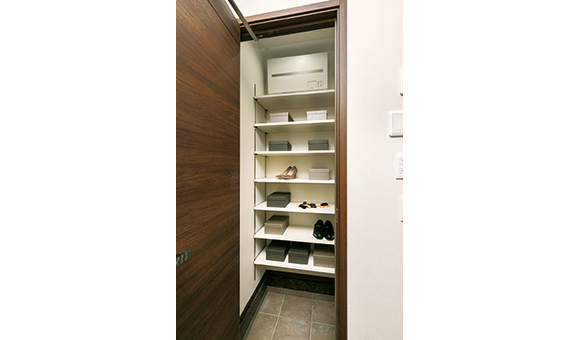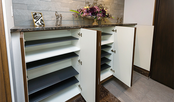 家族の靴などをたっぷりしまえる玄関収納。トールタイプやカウンタータイプなど、各邸の玄関形状に合わせて設置しています。