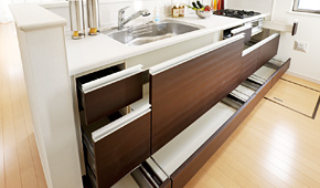 開閉が容易なスライド式。引き出しは吸い込まれるように静かに閉まるソフトクローズタイプです。